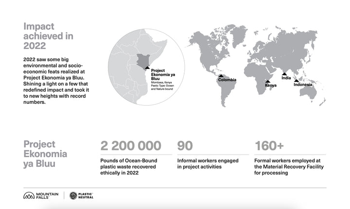 Through Project Ekonomia ya Bluu, Mountain Falls and rePurpose Global endeavours to prevent 100 million pounds of low value plastic waste from leaking into the Kenyan marine environment by 2030.